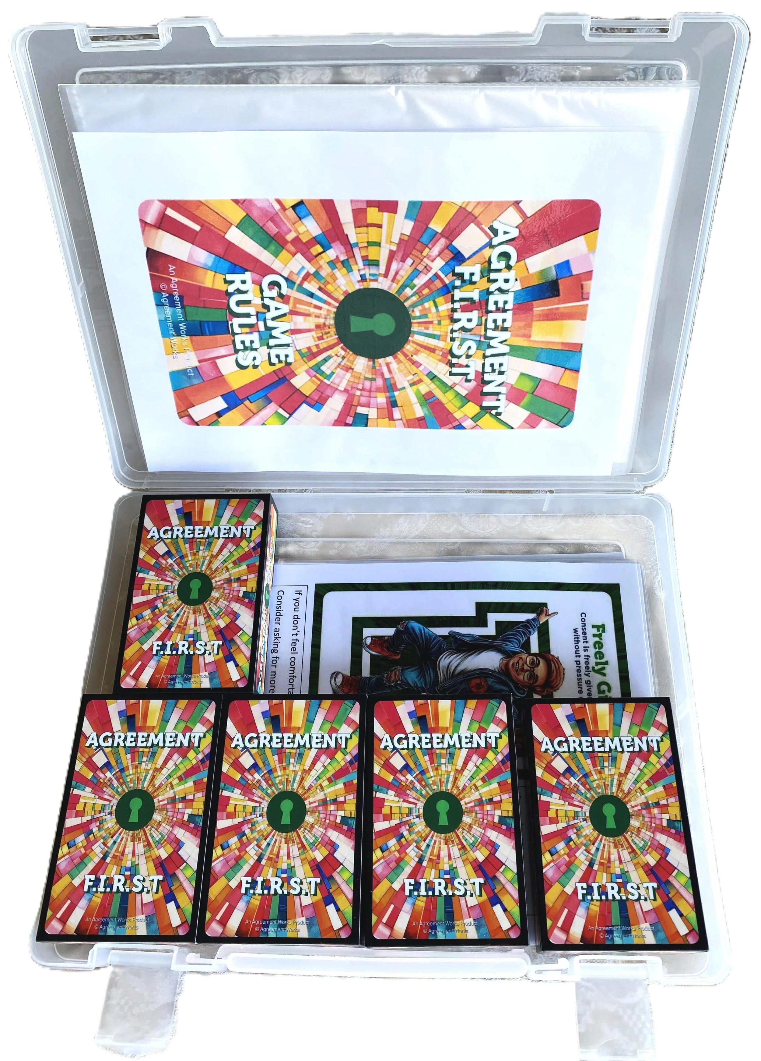 A set containing all the materials and content needed to conduct a consent card game and lesson: